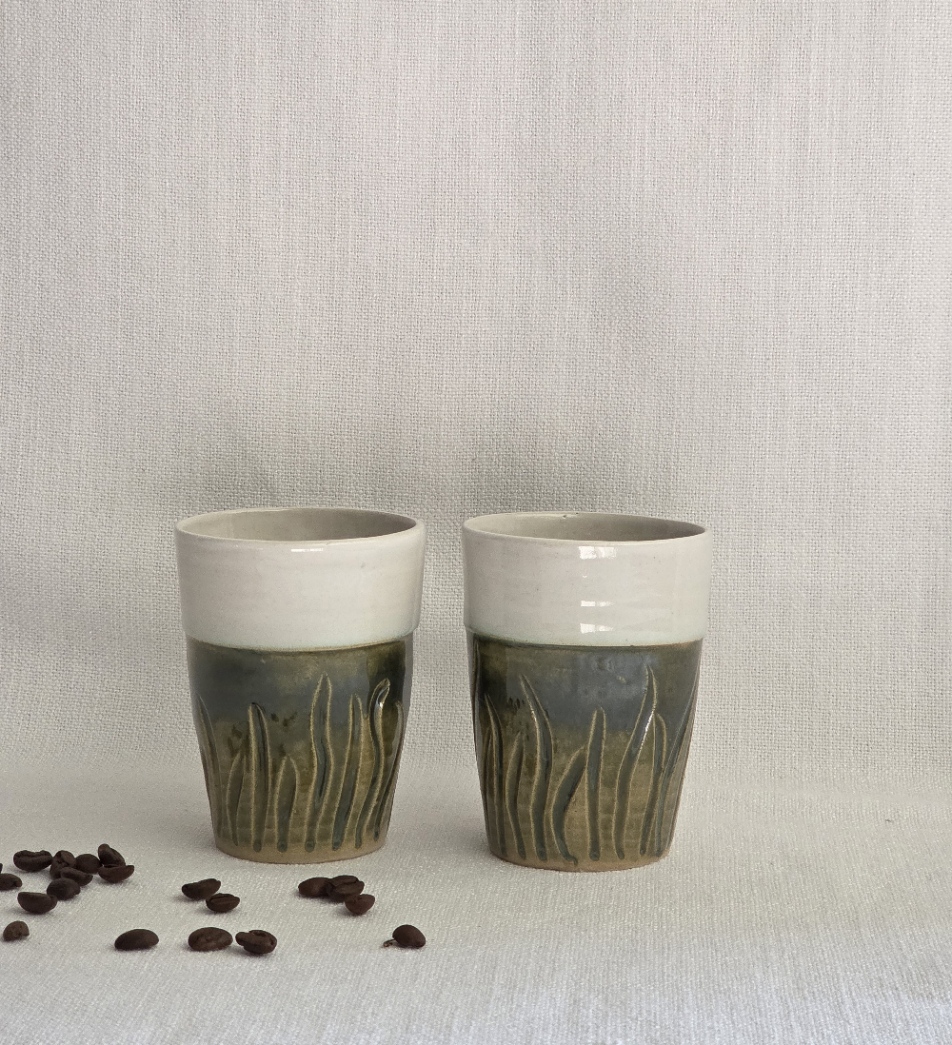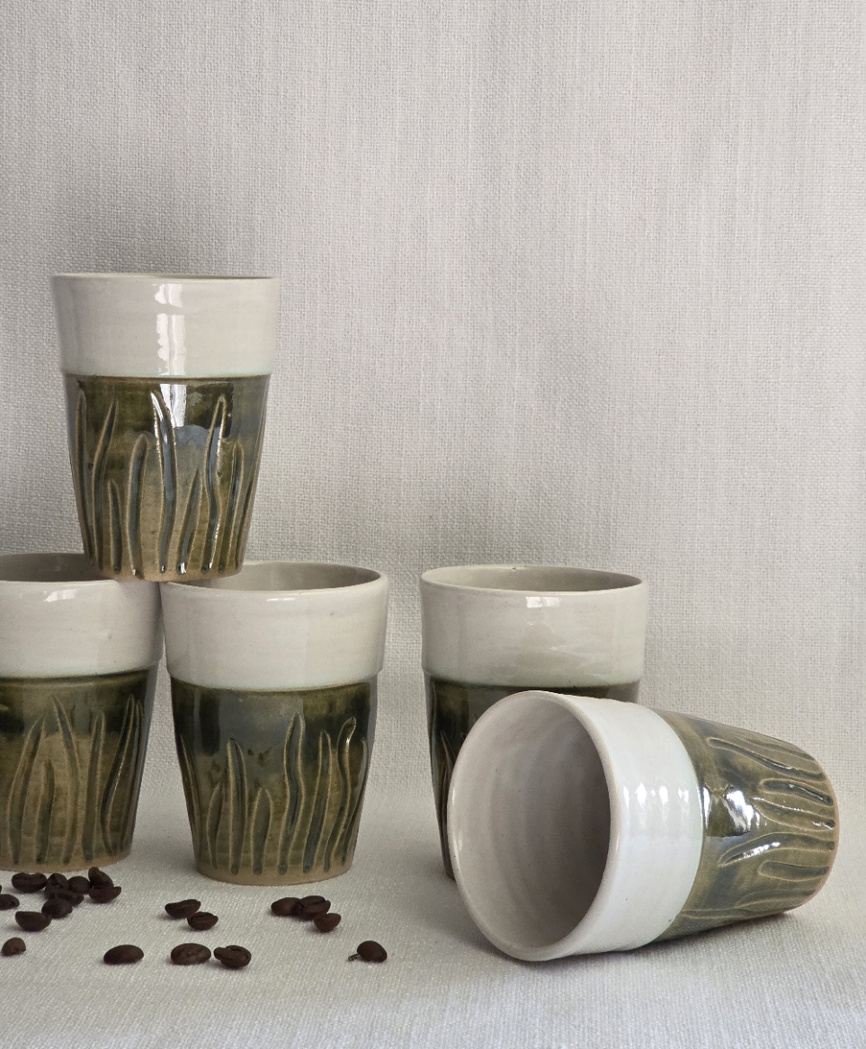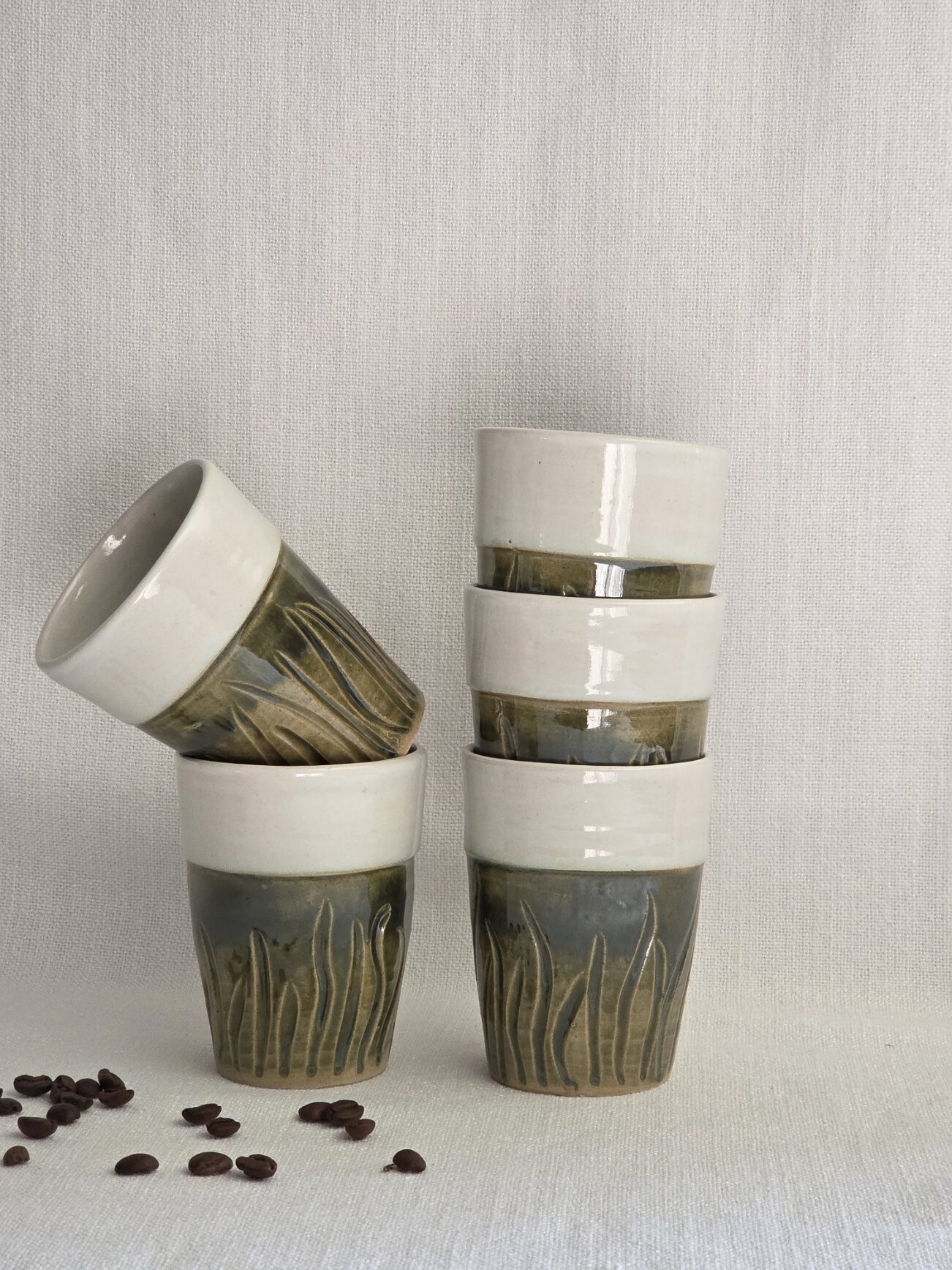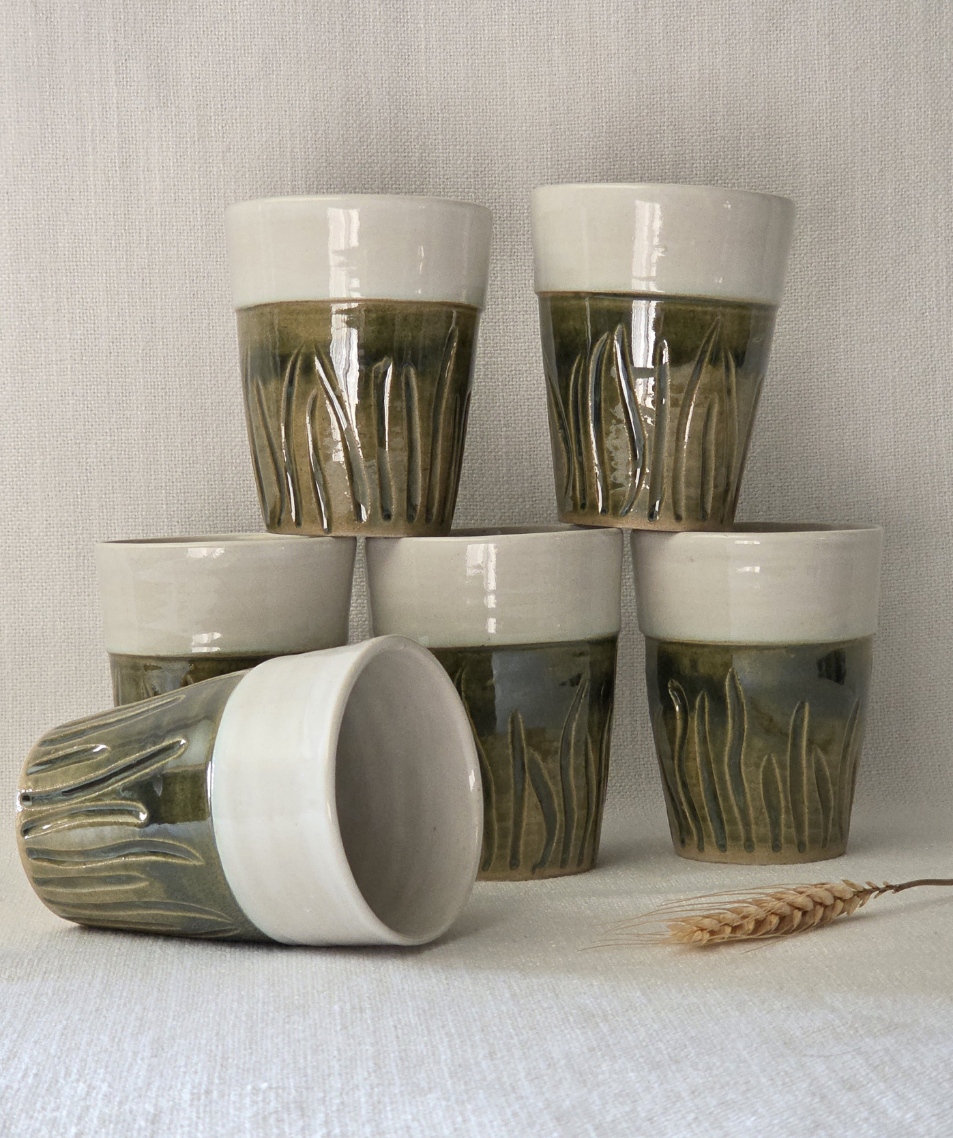 Kopje-beker in Olijfgroene, witte combinatie. Decoratie grassen. Mooi met de karaf!
